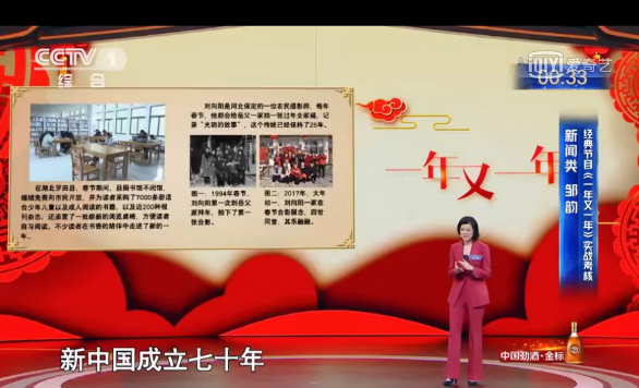 两张图片,一个是湖北罗田新年开放图书馆,一个是时隔20年的两张全家福。却很快的就被她化解成了物质文明和精神文明。通过全家福带出物质文明,再引出精神文明,然后就自然而然的过渡到开放图书馆这一张图片来。