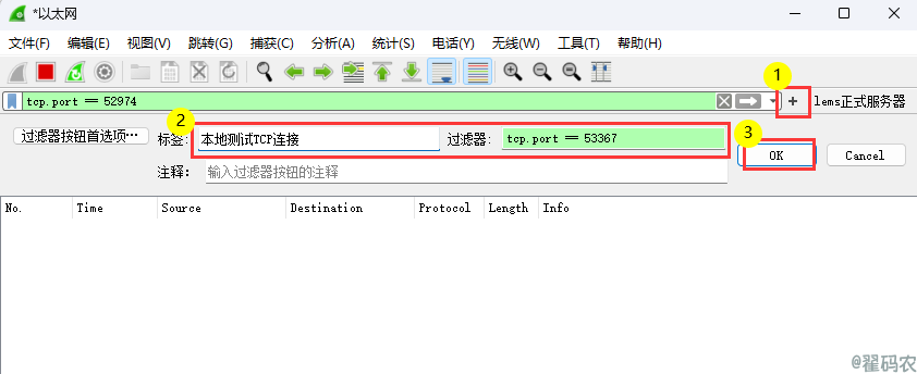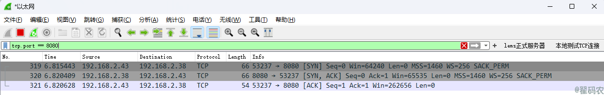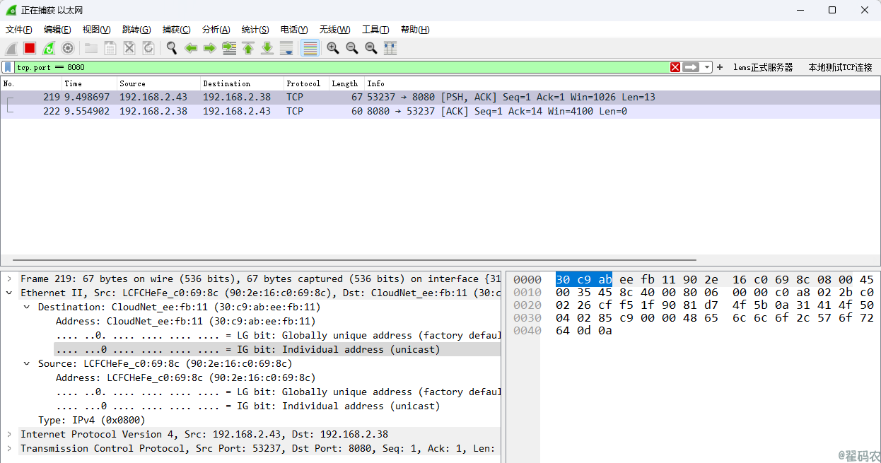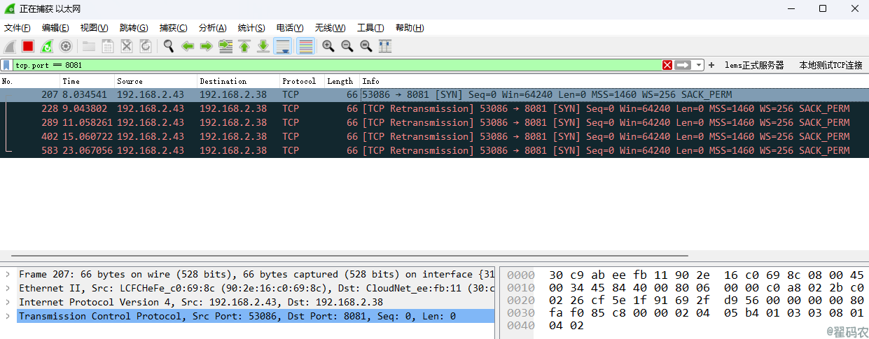 由于测试过程中,TCP客户端会需要反复断开连接,即端口会发生变化,所以在Wireshark抓包里,就按照TCP服务端的端口来过滤数据。