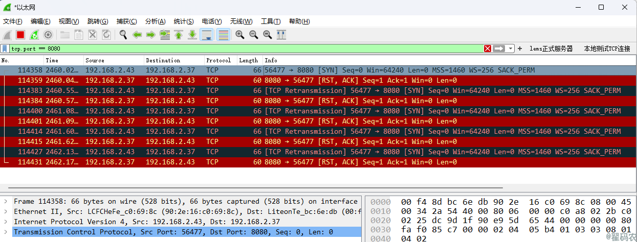 通过抓包可看到,灰色行114358表明是客户端向错误的ip发出的请求数据包,后面黑色TCP Retransmission都代表连接失败后,再次重新发出连接的请求。