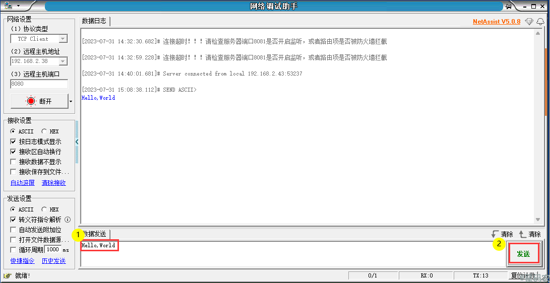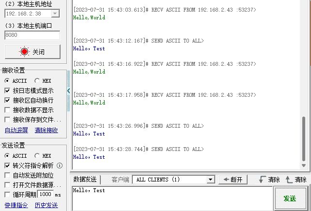 在TCP客户端发送Hello World,服务端数据日志窗口里,可以看到Hello World,即代表数据传输成功。