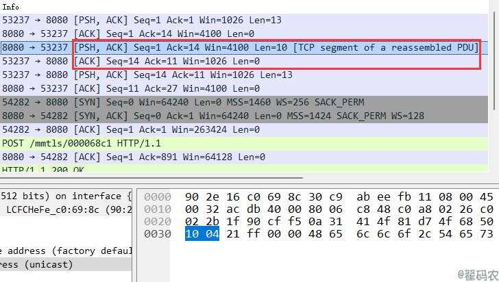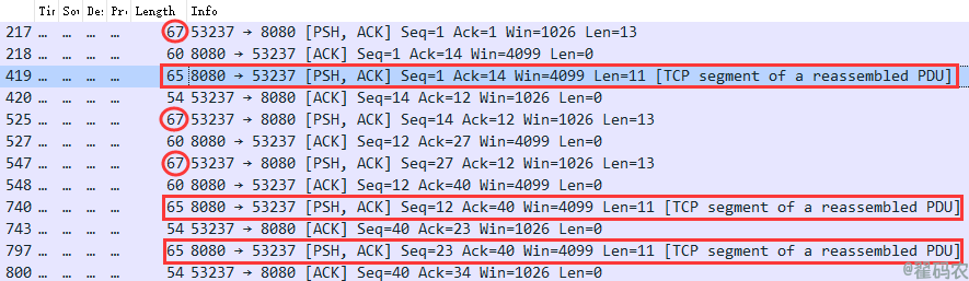 从下面的抓包记录可以看出,此时发送数据信号变为PSH,不再是建立连接阶段里的SYN信号。