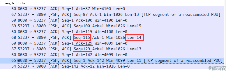 数据包的Seq(无论PSH还是ACK) = 上一次反向传输中的Ack值
