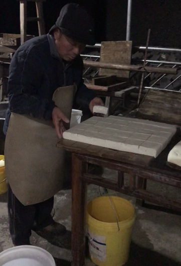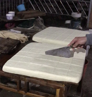 揭衣,到了此步骤,就代表豆腐已经做好,就需要将其划块了,划块之前,就需要先把包的豆衣揭开。
