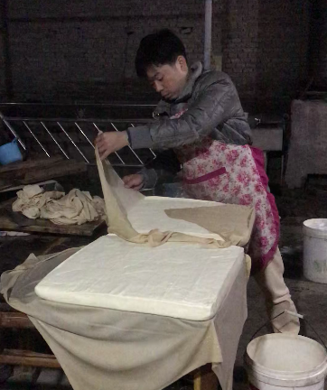 包衣,就是将豆腐脑舀进布里,避免后面挤压时豆腐脑流失,同时方便挤压掉豆腐脑中的水分。