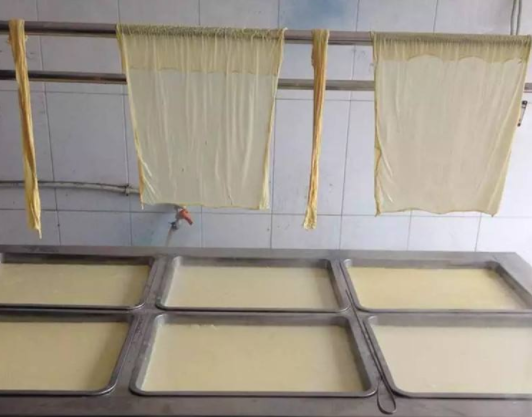 烧浆过程中,待膜形成,用竹竿挑起,再进行晾晒,也就成了我们日常在超市里看到的腐竹了。